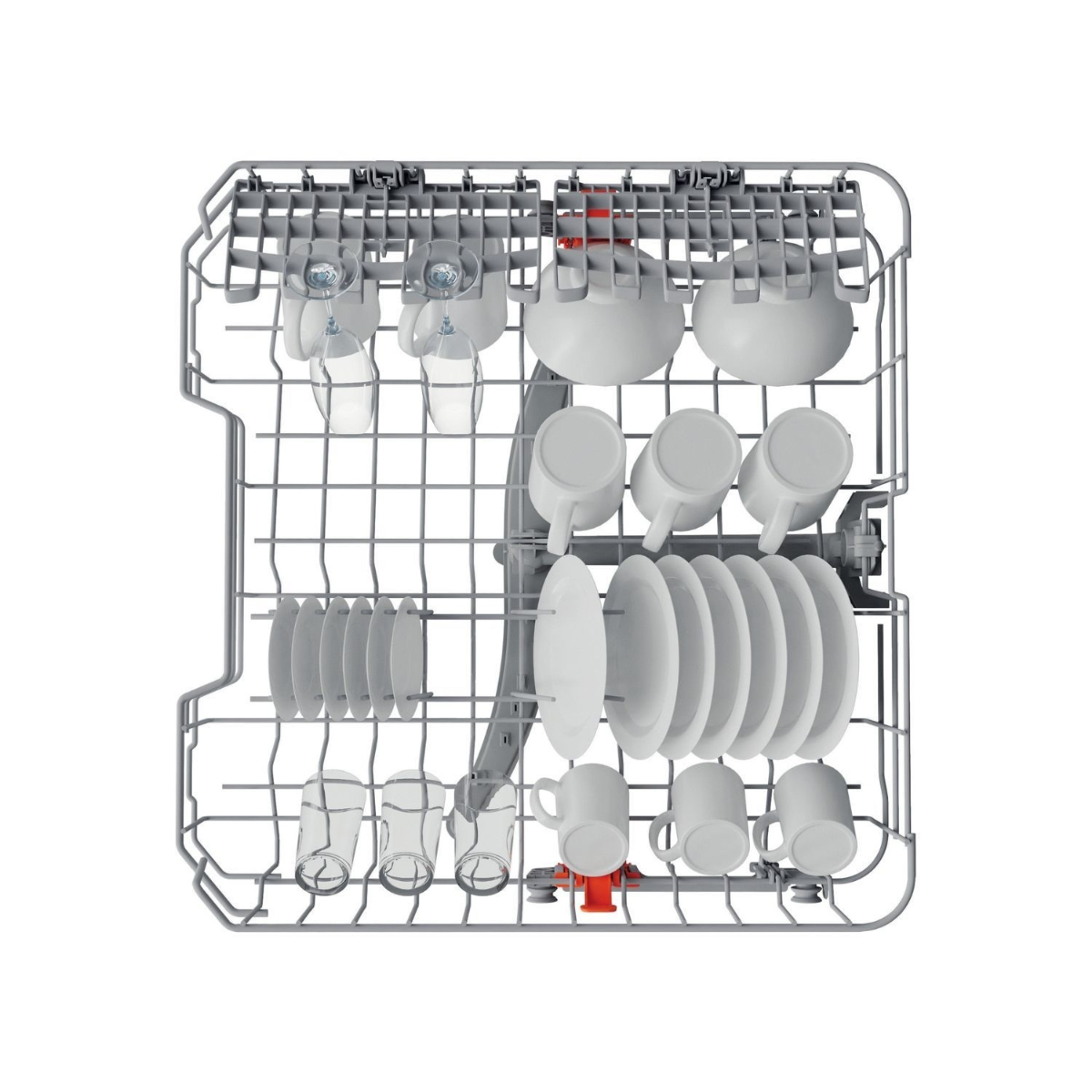 The Hotpoint H2F HL626 UK Dishwasher boasts an impressive capacity for place settings, ensuring efficient water usage. It also offers a convenient digital countdown timer to keep you informed about the wash cycle's completion. Additionally, its adjustable feet provide optimal stability, even on uneven floors and surfaces. Using only 9.5 liters of water to wash a full load, this dishwasher is eco-friendly and cost-effective, surpassing traditional hand-washing methods in water efficiency. The half load option only uses the required amount of energy and water without compromising on performance – designed for when the machine isn't full. Capacity for up to 14 place settings is created by a flexible storage system, including a Vertical Zone that lets you secure pans vertically to free up space in the lower basket. Thanks to its capacity to vary the spinning speed, the innovative Inverter Motor can properly calibrate water pressure and, therefore, cleaning force, in combination with an optimised electronic control at all times. The magnets allow precise control of sprayers, directing the water with the right pressure, in the right spot and at the right time.