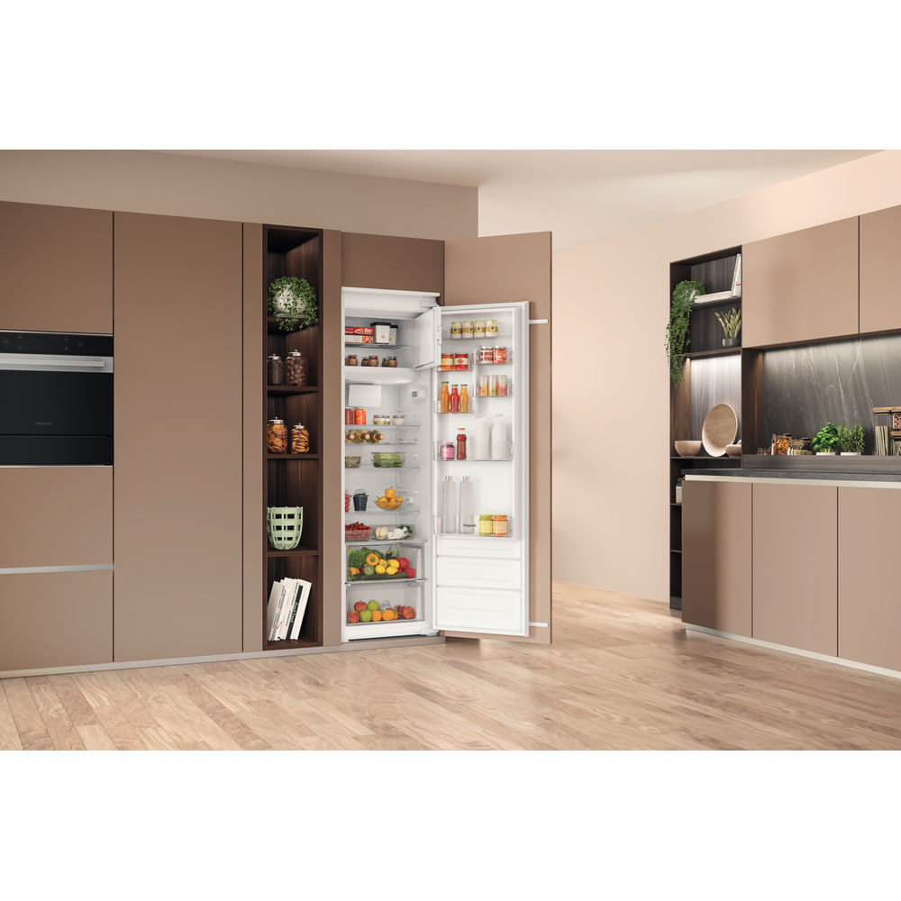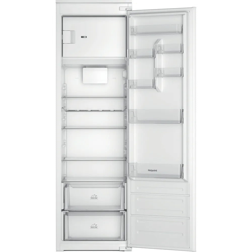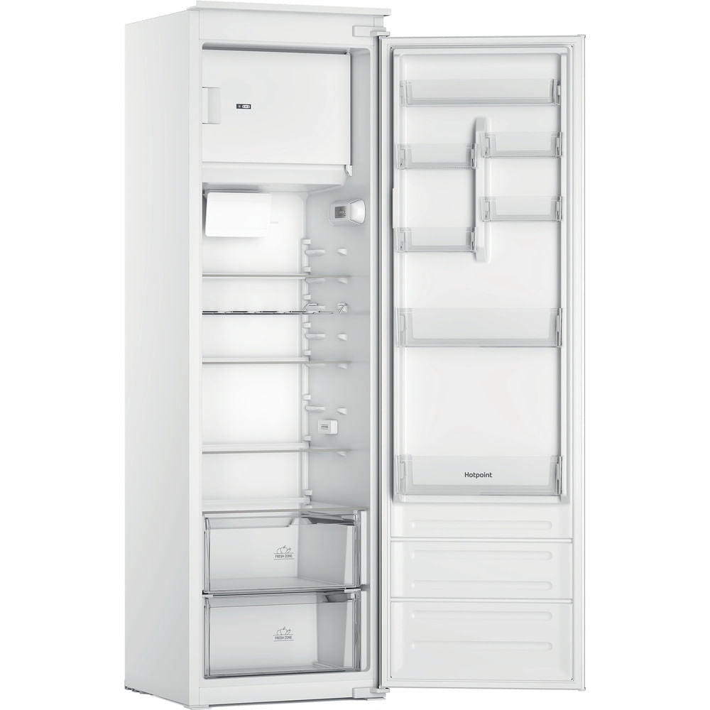 This Hotpoint Integrated tall fridge has a capacity of 292L, providing ample space for 16 shopping bags, so you can easily fit all your groceries in. Low Frost reduces ice build-up inside your appliance, so you need to defrost less often. Our quiet and durable Inverter Compressor immediately reacts to the door being opened, swiftly restoring a stable temperature to keep your food fresh and energy bills lower. Inside you'll find a Fresh Zone+ drawer, which keeps your fruit and vegetables fresh for up to 2 weeks*, maintaining the right temperature with the handy humidity control. There's also a 4 Star freezer compartment for your frozen food. Adjustable shelves give added flexibility to accommodate larger items effortlessly, while the wine rack is great for keeping your beverages chilled and tucked away neatly to maximise the space in your fridge. You can also create the perfect look with a matching freezer for a harmonious kitchen. *Based on weight loss and visual quality, considering common fruits and vegetables. Internal test procedure.