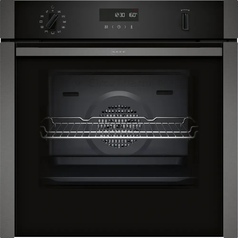 This Neff oven is a true kitchen helper. With Home Connect, you can control and monitor your oven from anywhere and even discover new recipe ideas through the app. The Slide&Hide door slides under the oven for easy access without bending down. Cleaning is simple with the pyrolytic self-cleaning function, which uses high heat to turn food residue into ash. For everyday cleaning, EasyClean uses steam to soften residue, making it easy to wipe away.