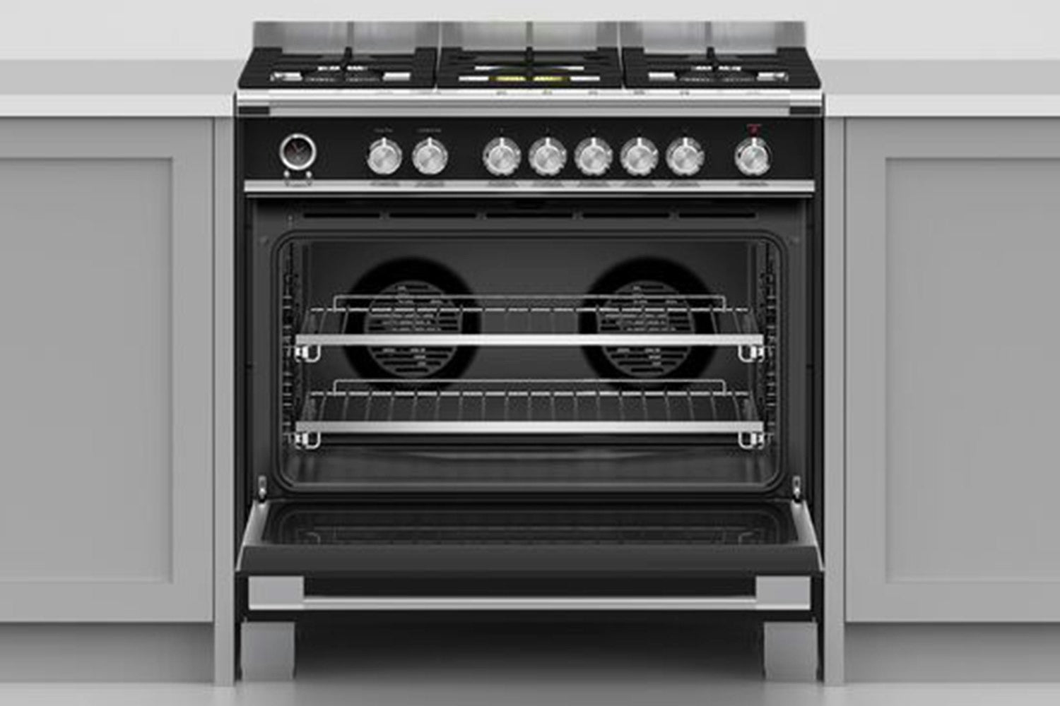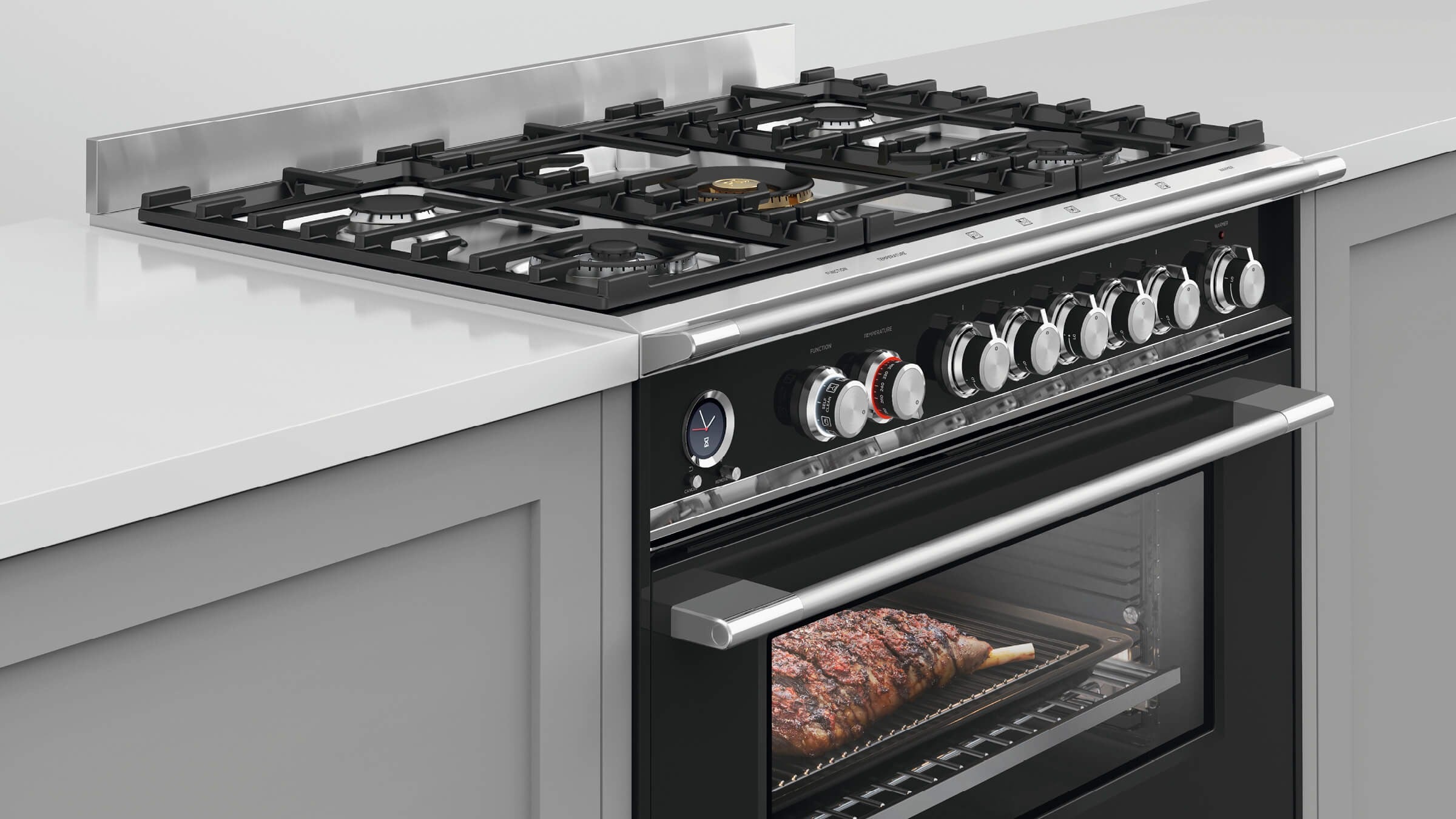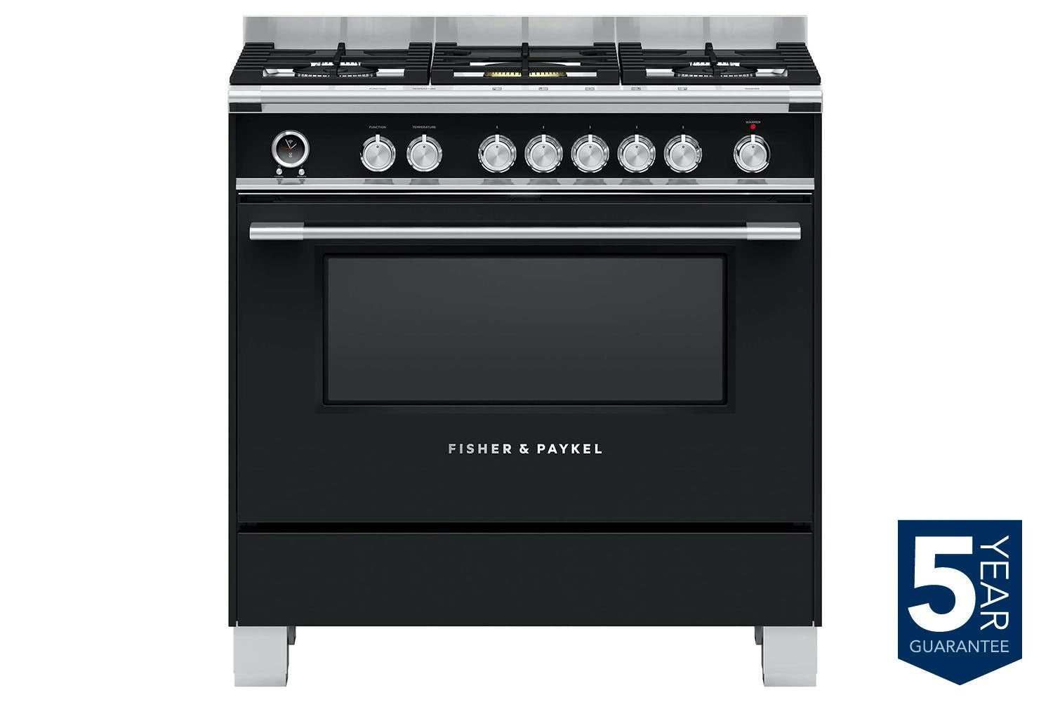 Get heritage styling and contemporary performance with this 90cm Fisher & Paykel Freestanding Cooker. You can cook several dishes at the same time with its spacious induction cooktop and generously sized, self-cleaning convection oven. Instant heat and precise control add modern functionality to the classic styled black finish. Five burner hob with with dual wok burner and two powerful triple ring burners, Convection oven with 140L capacity and nine oven functions plus rotisserie including Pastry Bake with pizza mode. Non-tip full-extension shelves for safe removal of hot dishes, Pyrolytic self-clean that breaks down food residue for an easy clean.