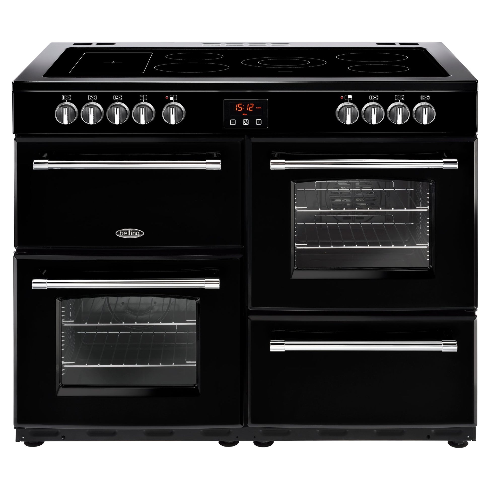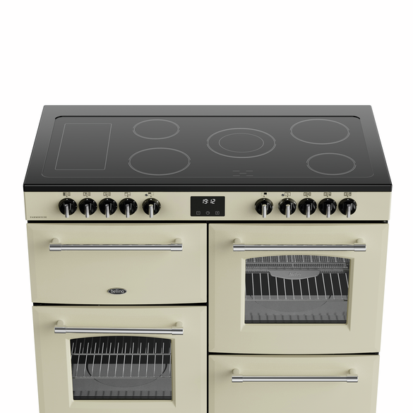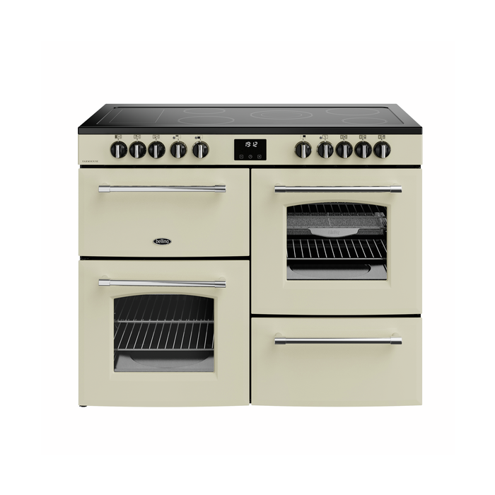 110cm electric range cooker with 5 zone ceramic hotplate plus warming zone, Maxi-Clock and easy clean enamel.