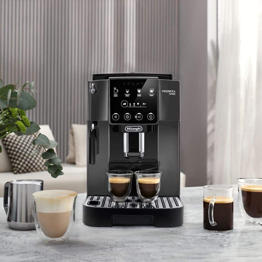 Enter the world of bean-to-cup coffee with De'Longhi Magnifica Start, providing everything you need to get started with your favourite espresso-based drinks at home. It features a user-friendly interface and grey & black finish, with a customised selection of beverages delivered with just one touch.