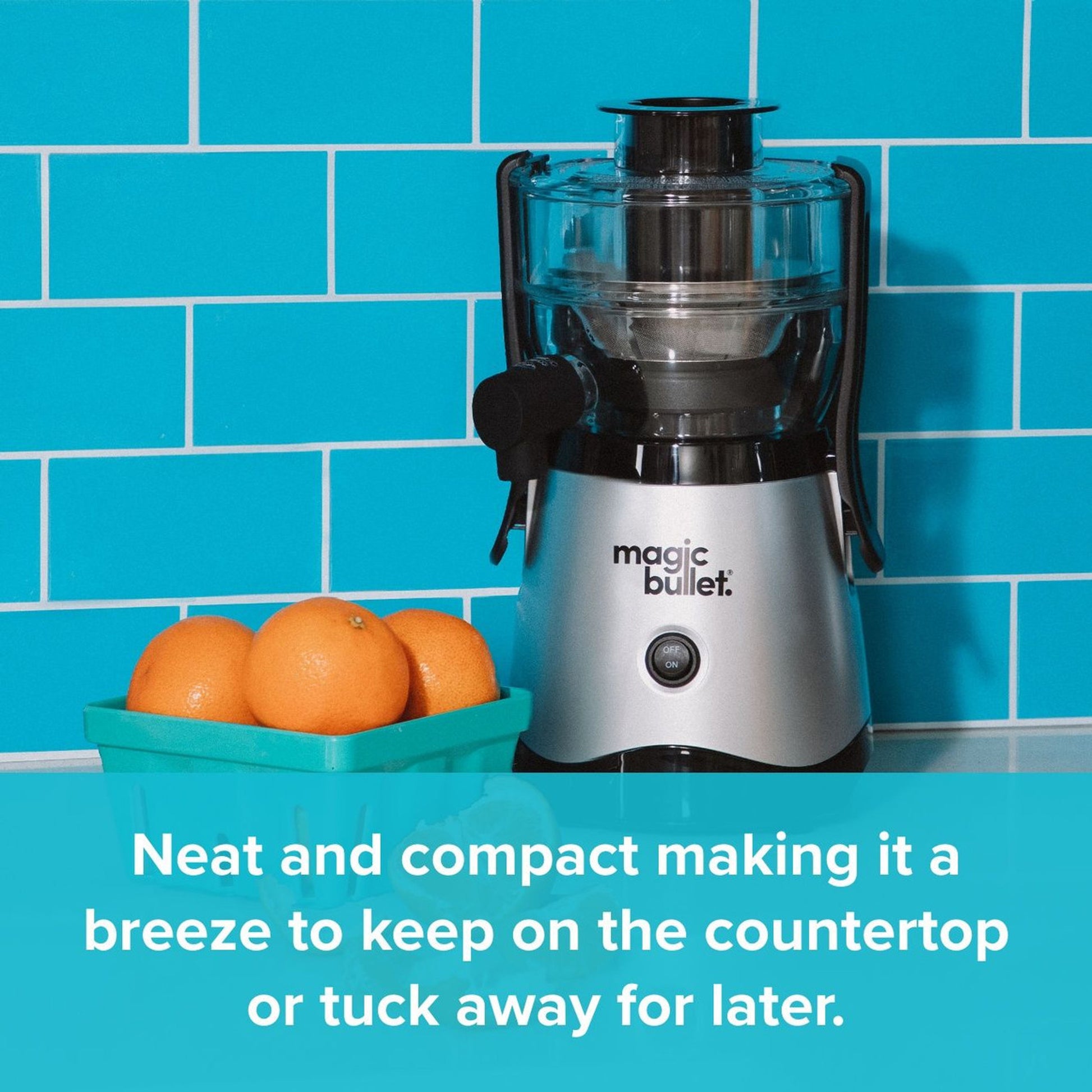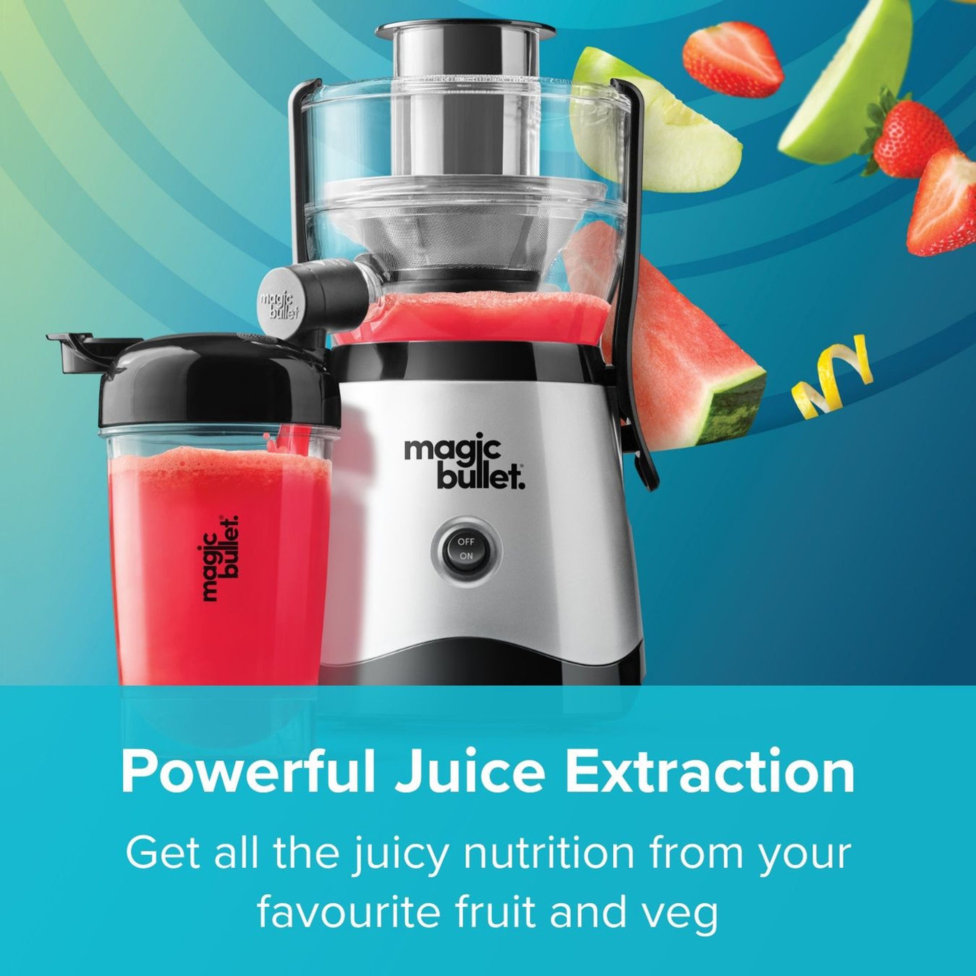 Mini but mighty, pint sized but powerful, Magic Bullet Mini Juicer is just 31cm tall but lets you juice a full 470ml of fresh deliciousness.