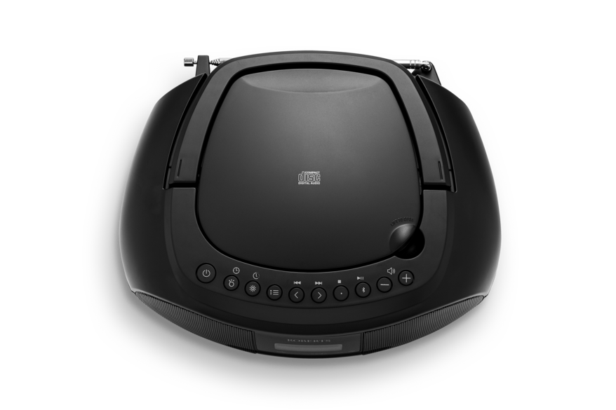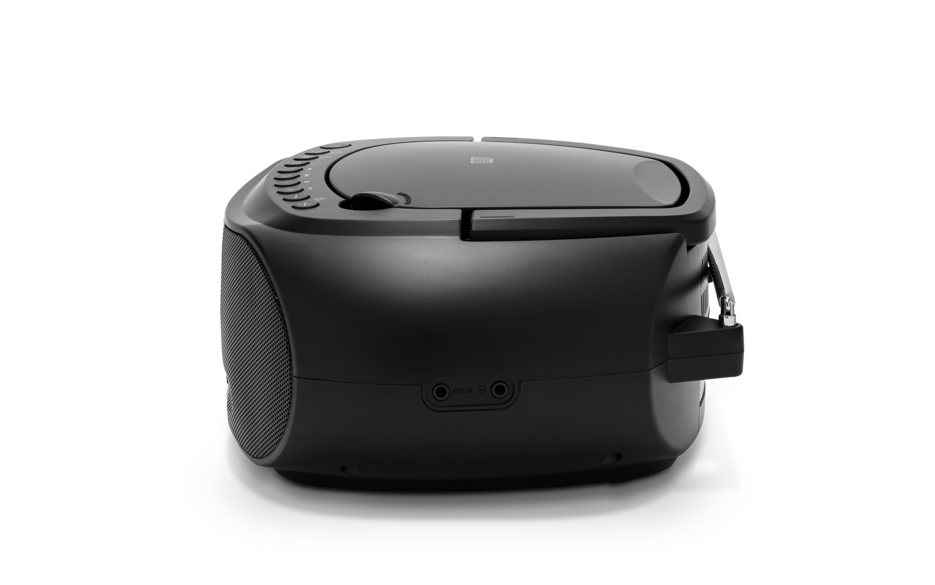 DAB/FM portable boombox with 60 presets, CD, USB playback and charging, Bluetooth, headphone socket, line out, 5 EQ presets with sleep timer and LCD display with adjustable brightness.