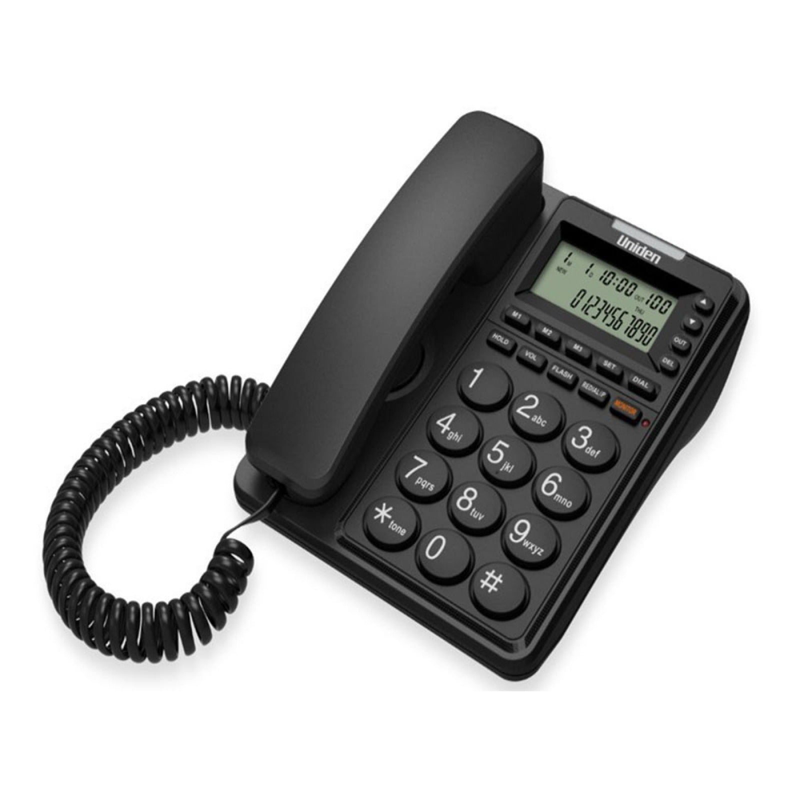- Large illuminated screen display date, time and number of incoming, outgoing and unanswered calls.